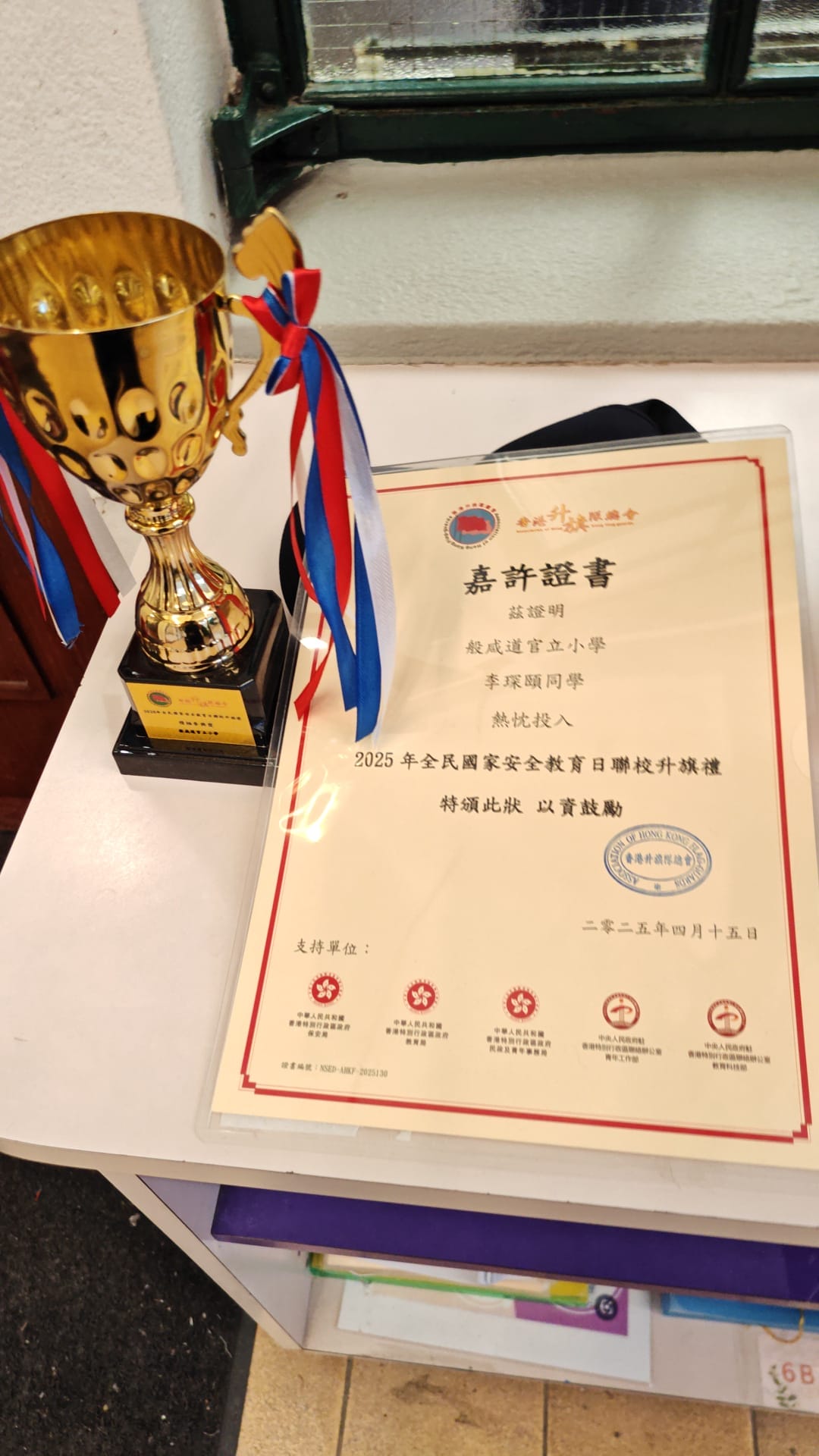 9月11日恒常升旗禮上,5A班李琛頤同學榮獲升旗總會頒發「熱衷投入2025全民國家安全教育日聯校升旗禮」證書及獎杯,表彰其對國家儀式的積極參與與卓越表現。此次頒獎不僅肯定李同學的個人投入,更樹立榜樣,激勵全體般官學生積極參與國家安全教育,深化對國民身分的認同與責任感,強化愛國情懷。