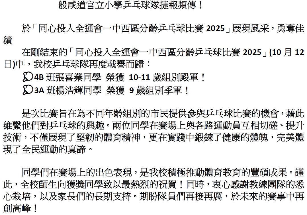 同心投入全運會一中西區分齡乒乓球比賽2025