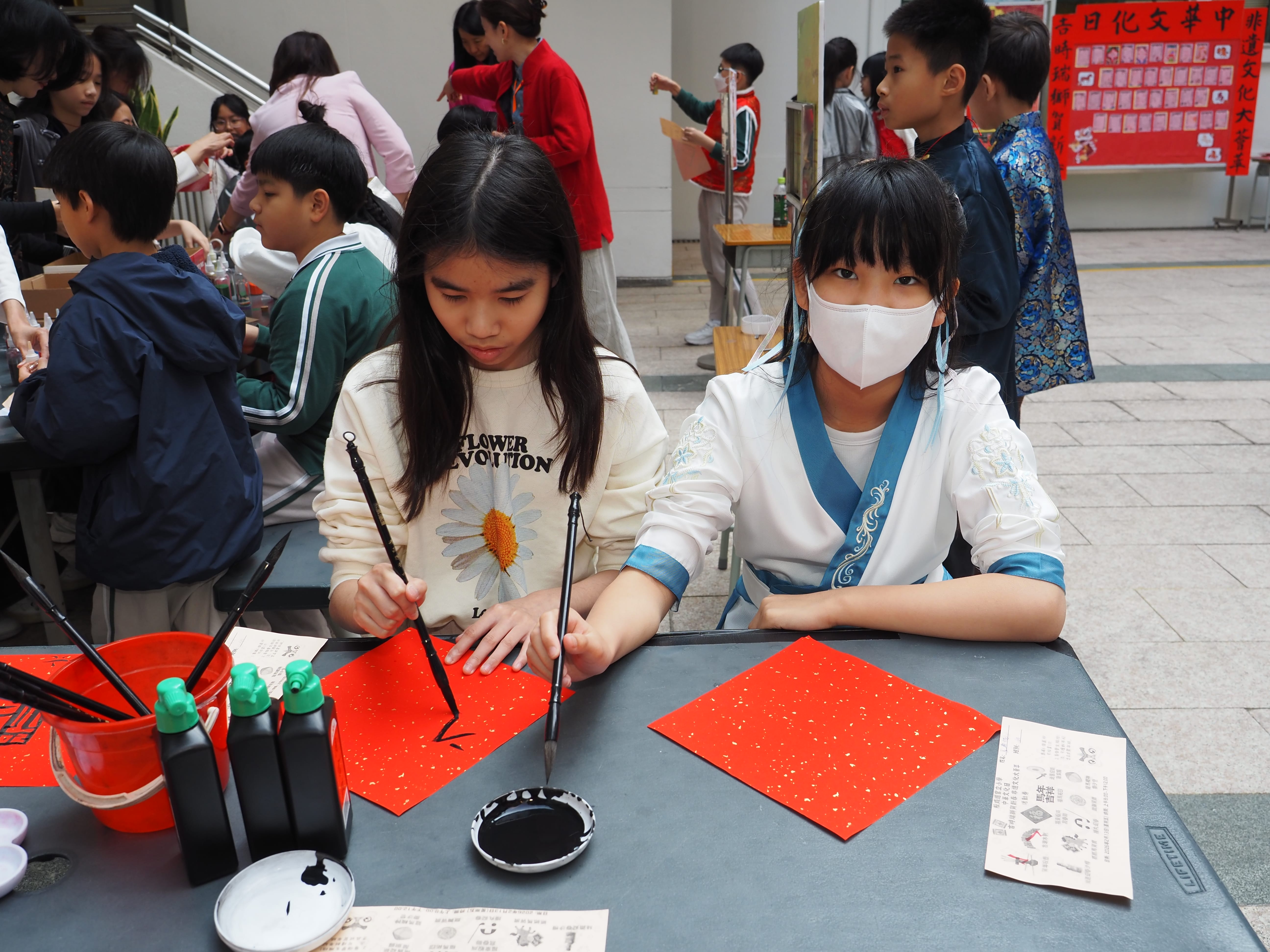 活動當日,校園處處充滿喜慶與溫暖。家教會書法班的家長們揮毫潑墨,專心書寫「福」字揮春,為全校同學送上滿滿祝福。各班同學有序來到禮堂,領取寓意吉祥的揮春,在墨香與笑聲中感受書法藝術之美與新春喜氣。