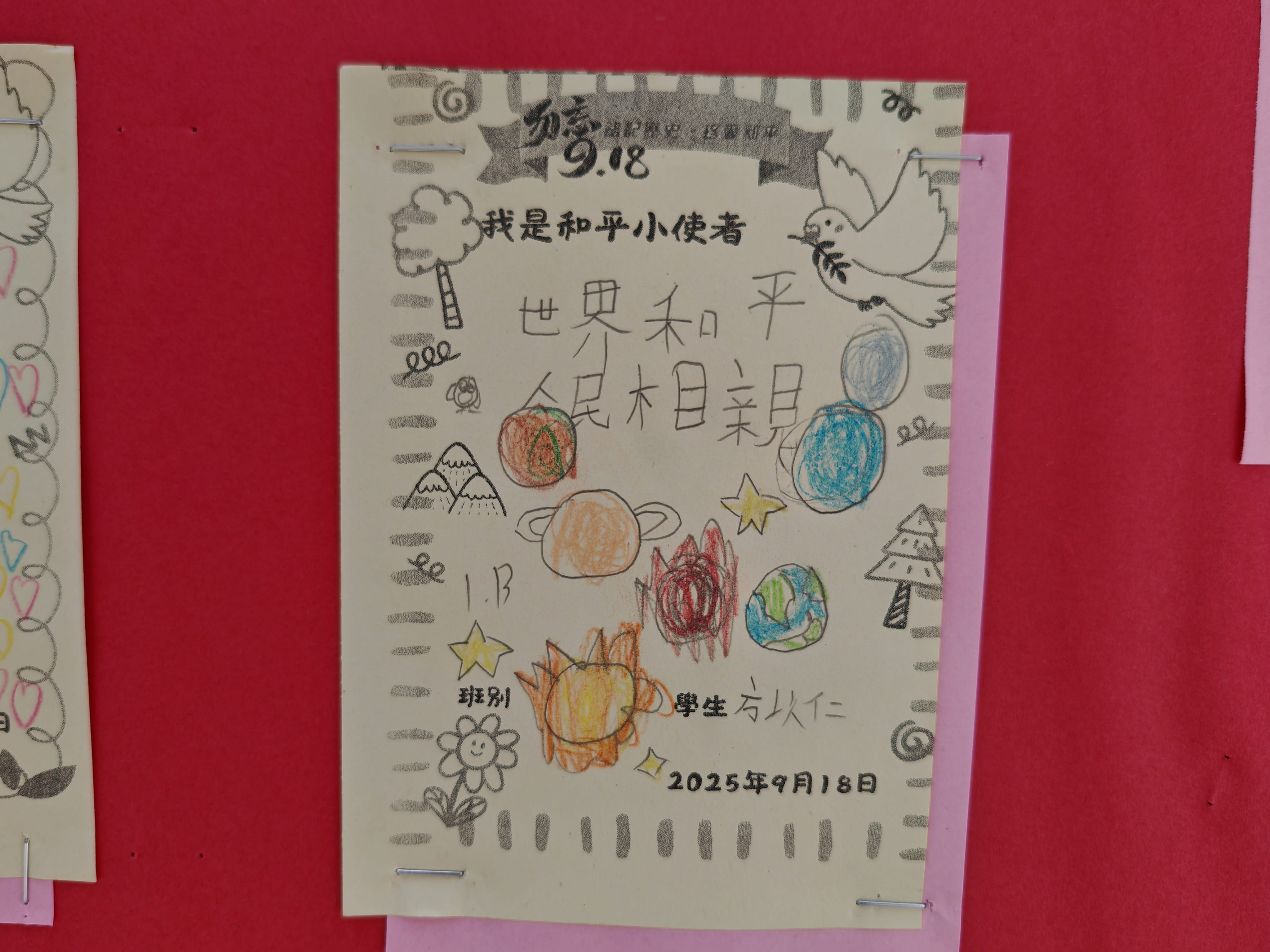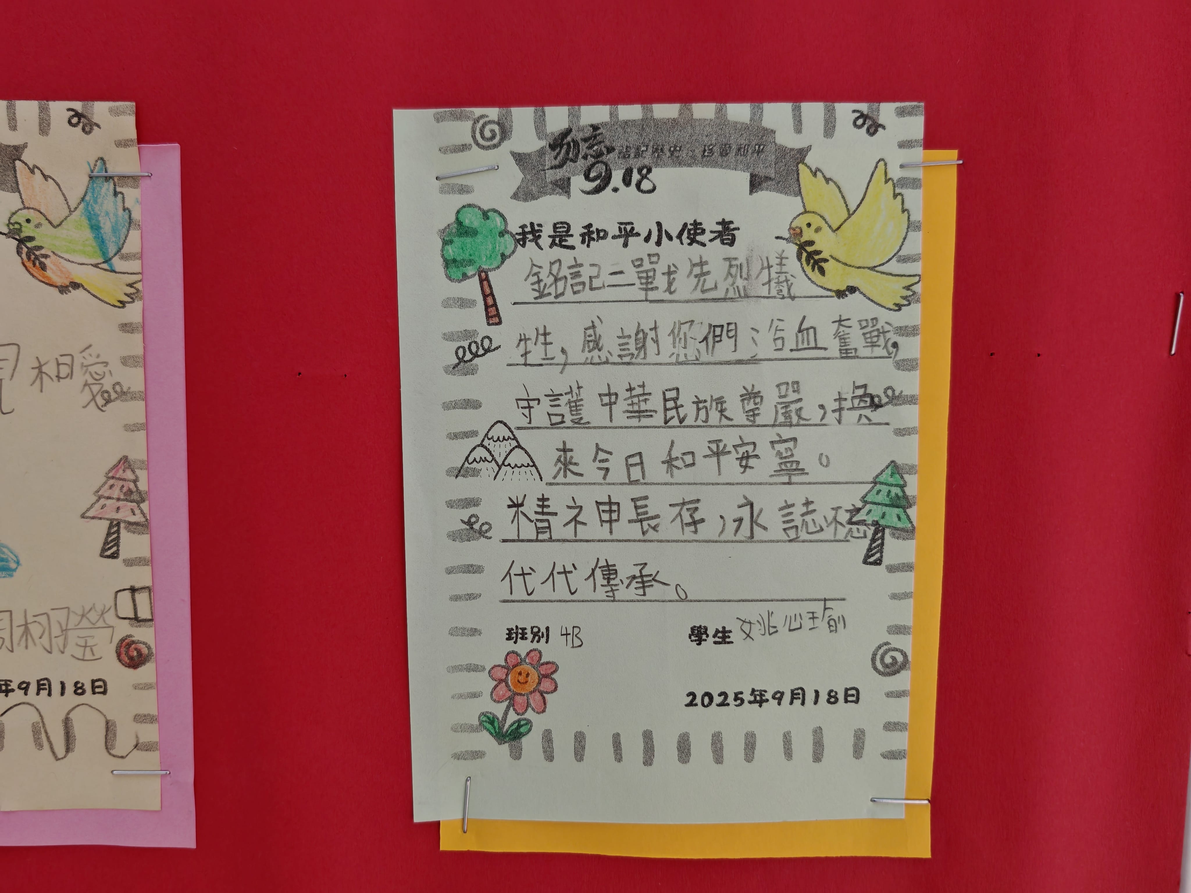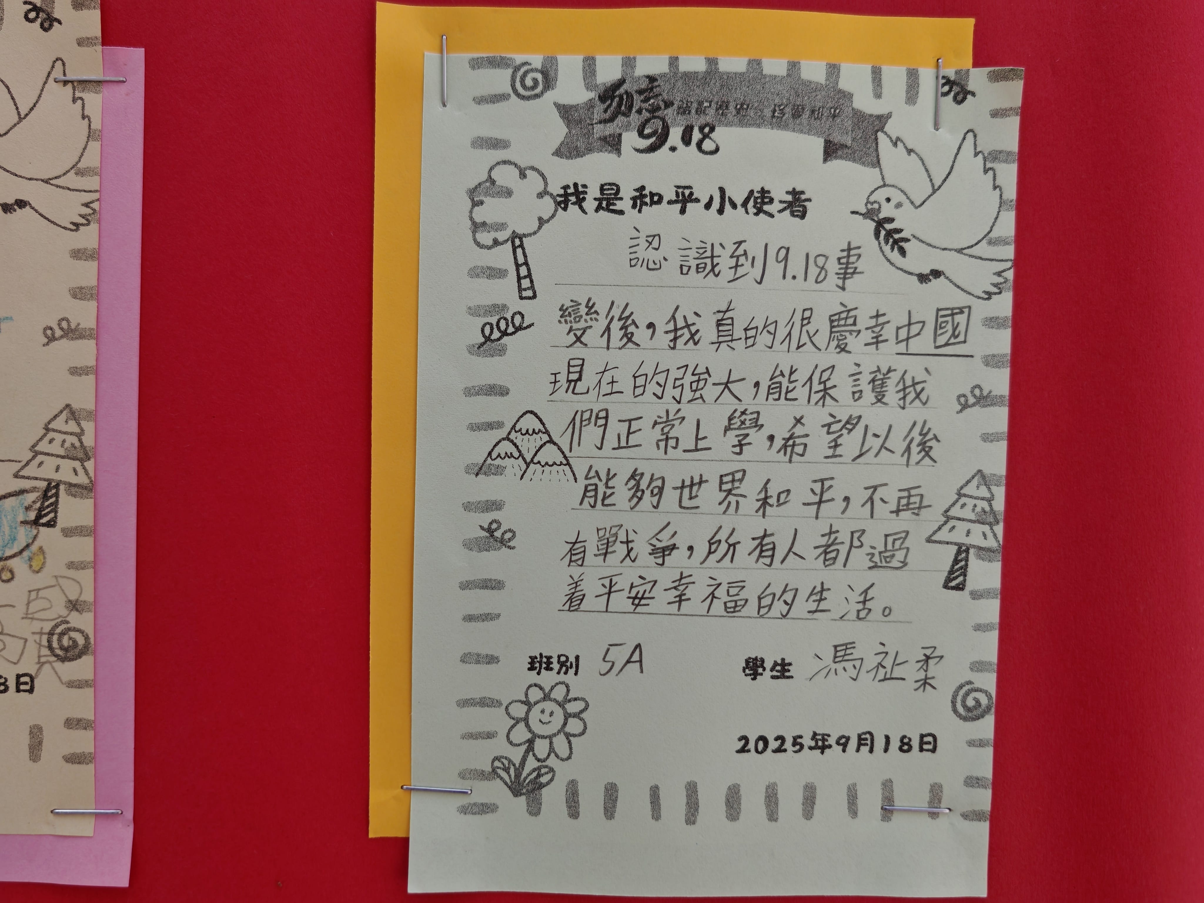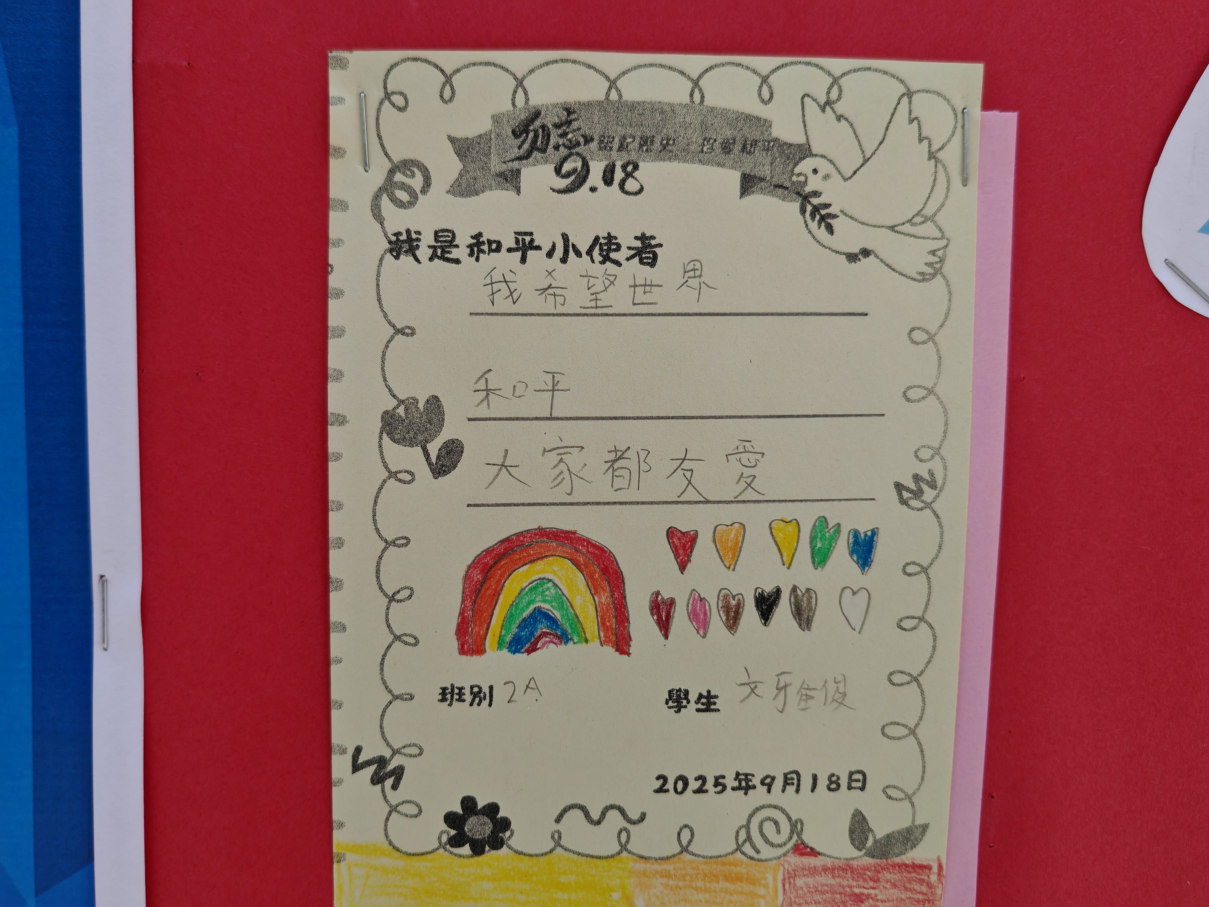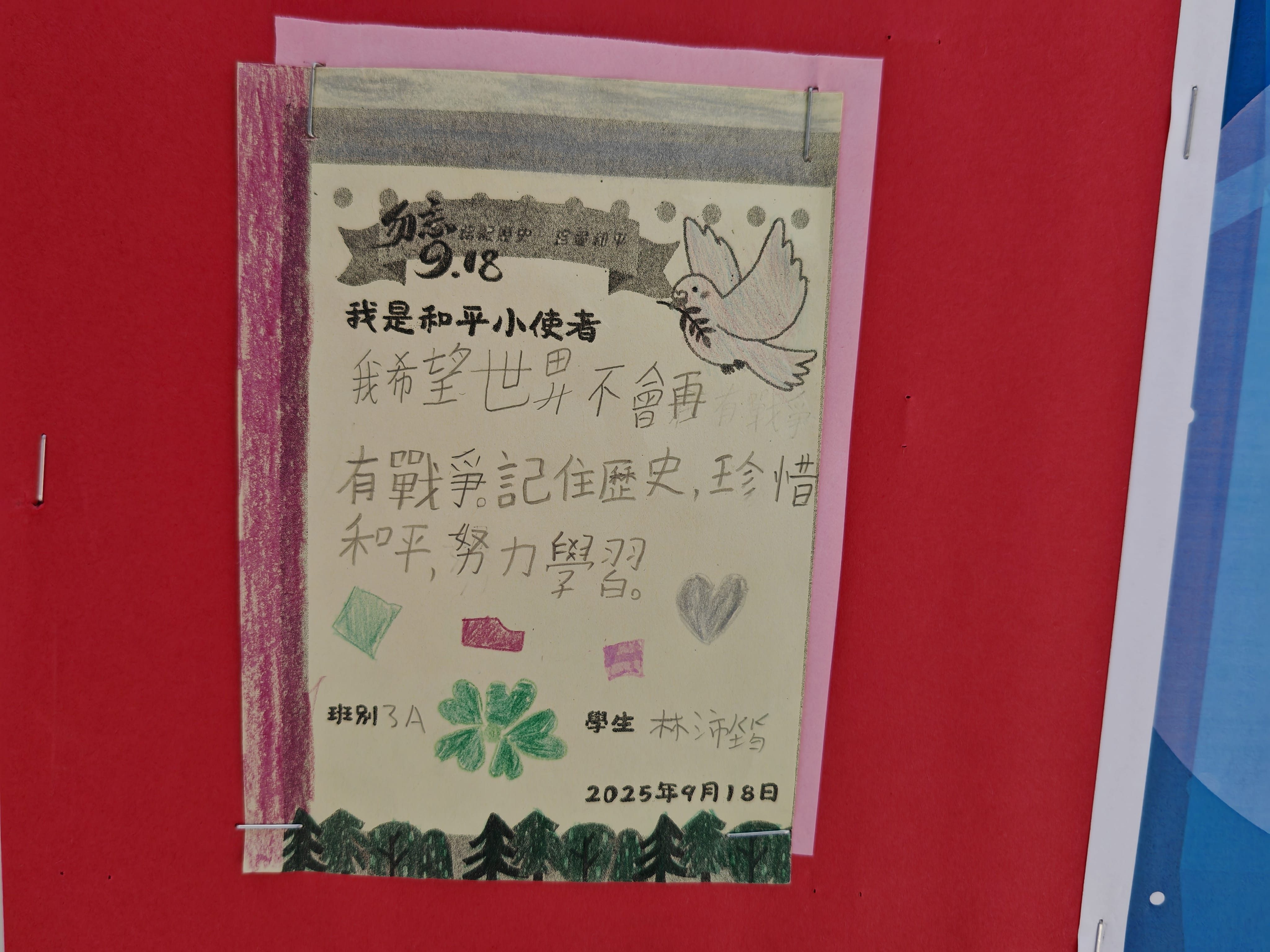 活動在莊嚴的升旗儀式中開始,師生肅立致敬。隨後由國民教育主任進行旗下講話,鼓勵同學以實際行動守護和平,並於默哀環節中緬懷歷史、尊重生命。下午更安排觀看歷史教育短片及製作「和平心願卡」,鼓勵學生爭做「和平小使者」。