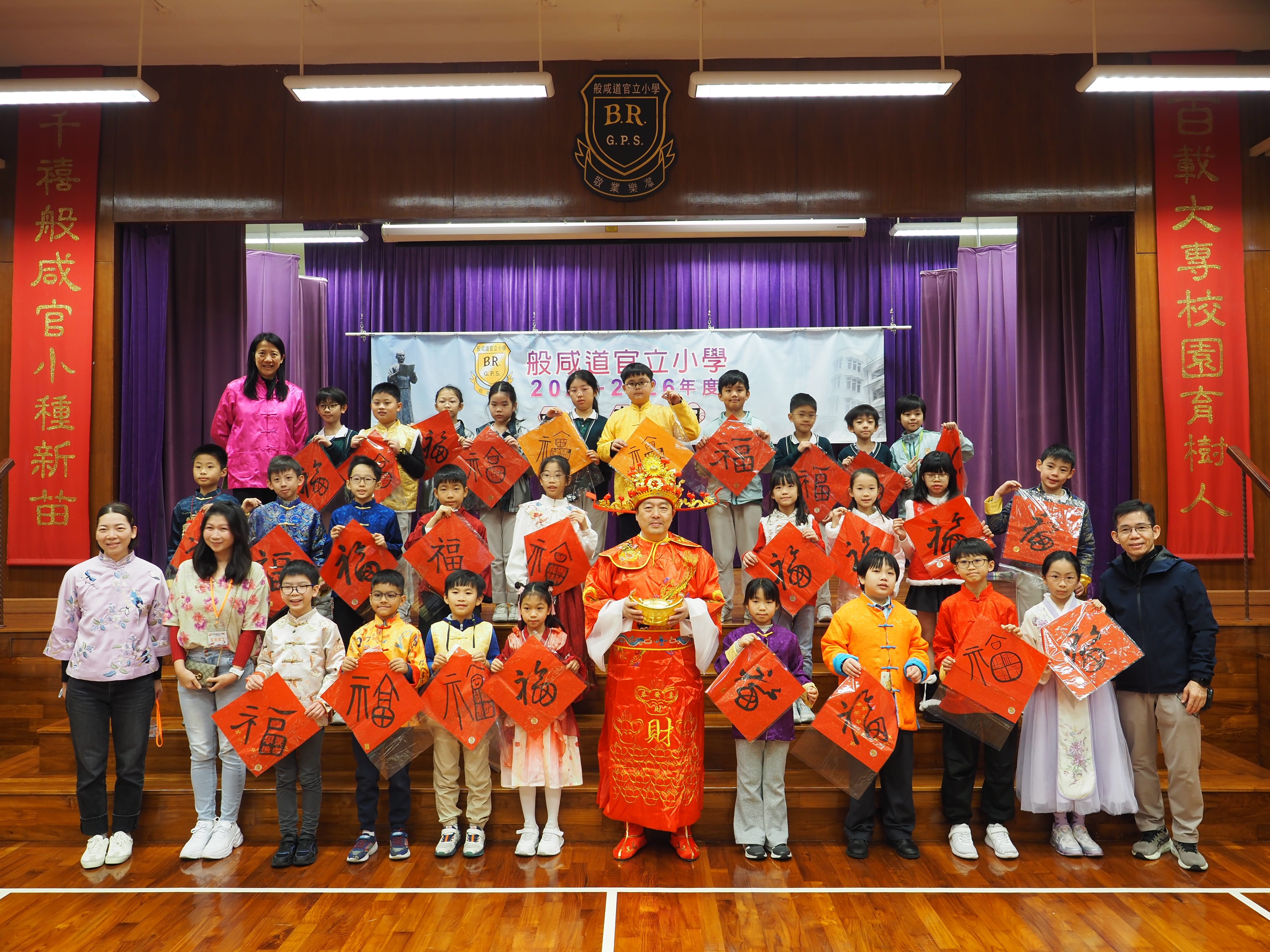 2026 年 2 月 13 日,般咸道官立小學校園洋溢着濃郁的傳統文化氣息,一年一度的中華文化日順利舉行。本次活動以「弘揚中華優秀傳統文化、厚植學生文化自信、凝聚家校同心力量」為宗旨,透過體驗、互動遊戲與演出,讓師生、家長在歡樂中認識中華文化的博大精深,感受傳統節俗與國學智慧的獨特魅力。
