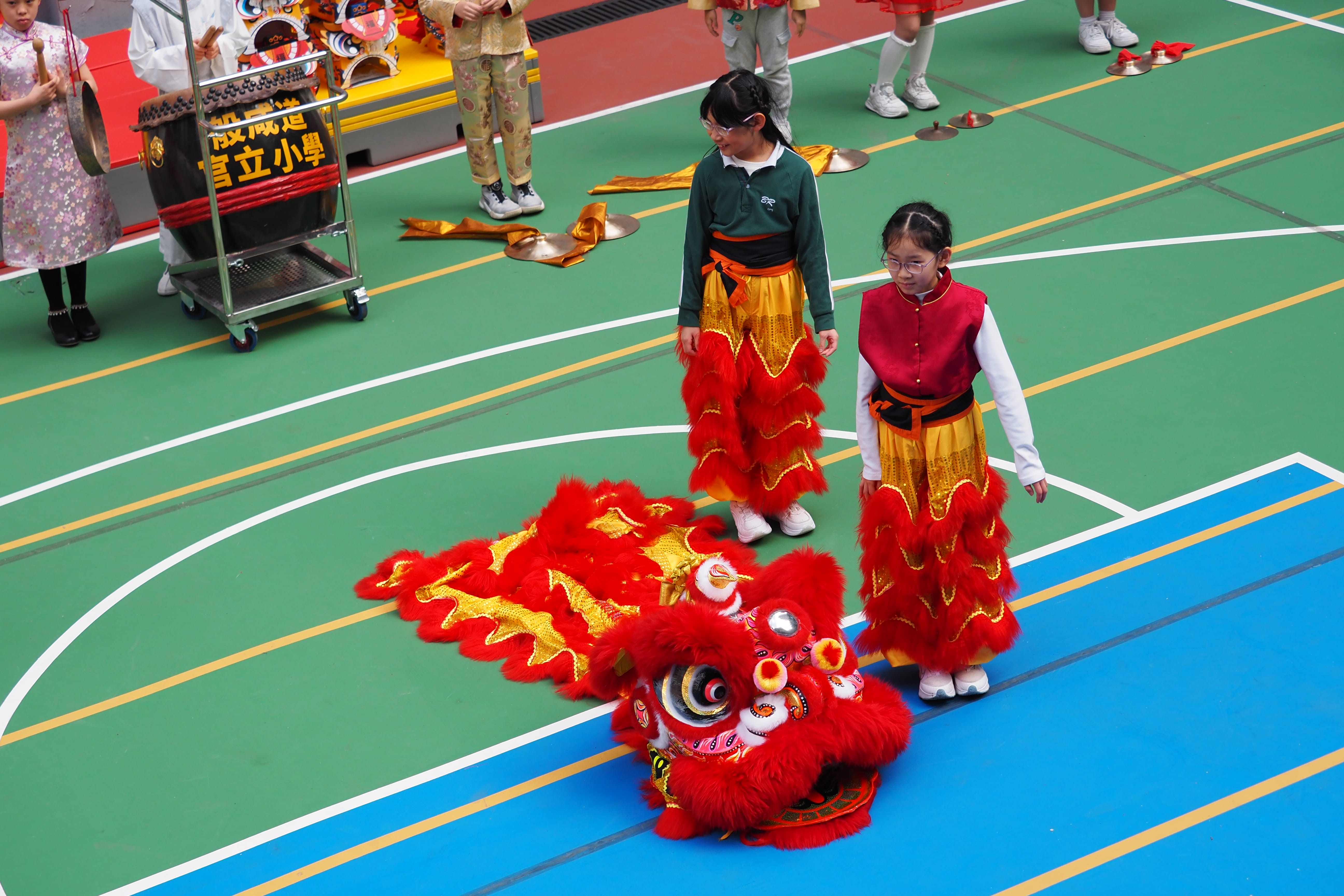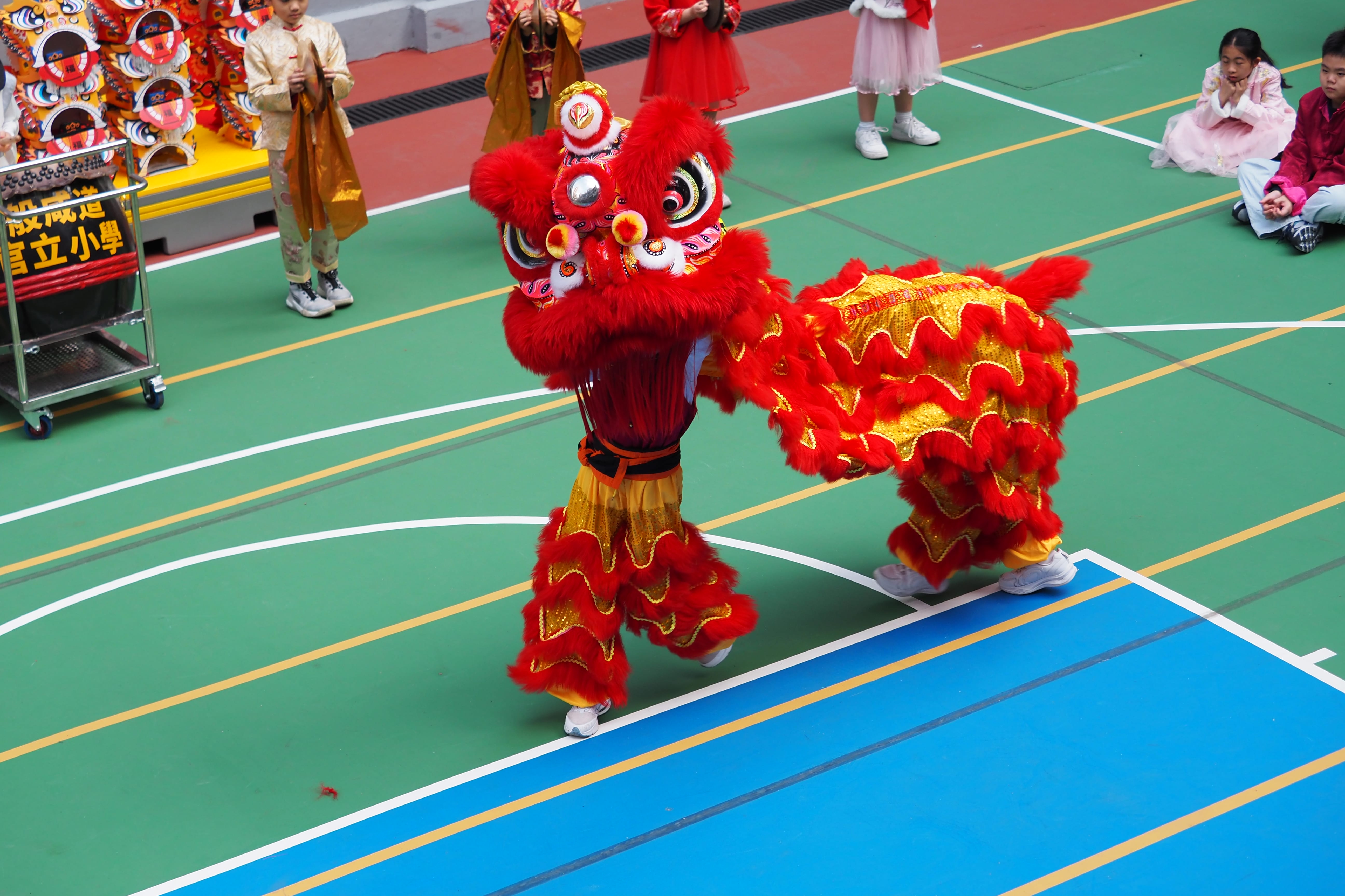 精彩的舞獅表演登場時,全場氣氛熱烈。同學們早前跟隨專業舞獅師父勤奮學習技藝, 2B 班周晞諾、周晞悠同學穿上傳統服飾登場獻藝,靈活的獅步、精采的動作贏得陣陣掌聲;其他同學在旁配合敲鑼打鼓,以傳統樂器為表演伴奏,展現團隊合作精神與對傳統技藝的熱愛。校長更化身「財神」現身校園,向同學們派發祝福,喜氣洋洋,為活動增添熱鬧氛圍。